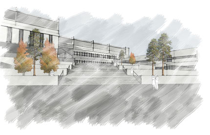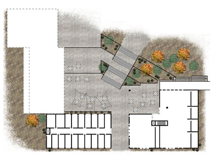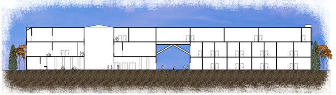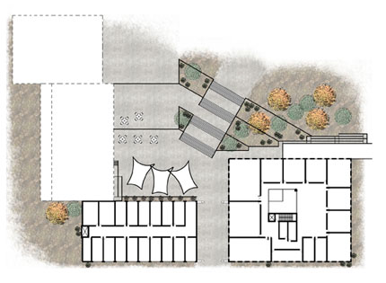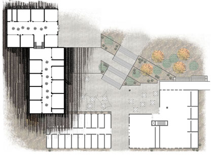 The north building also seeks to work with the site’s unique topography. Both the main building and the expansion flow down the existing slopes. In key areas, the buildings cuts into the hillside, creating the major advantage of saving space above ground, which better matches the low profile character of the surrounding neighborhoods. | ||