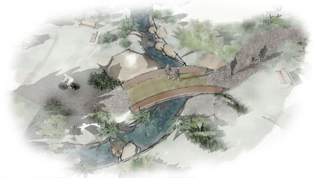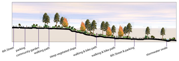The image to the left shows closer illustration of the Community Garden space and where the pathway intersects with the swale a small bridge is provided to pass over the swale. There are numerous seating areas near these nodes and scattered throughout the vegetated areas. Each path averages 8-12 feet in width to accommodate both walking and biking; the paths may be divided in the center by vegetation to separate the two user groups. |