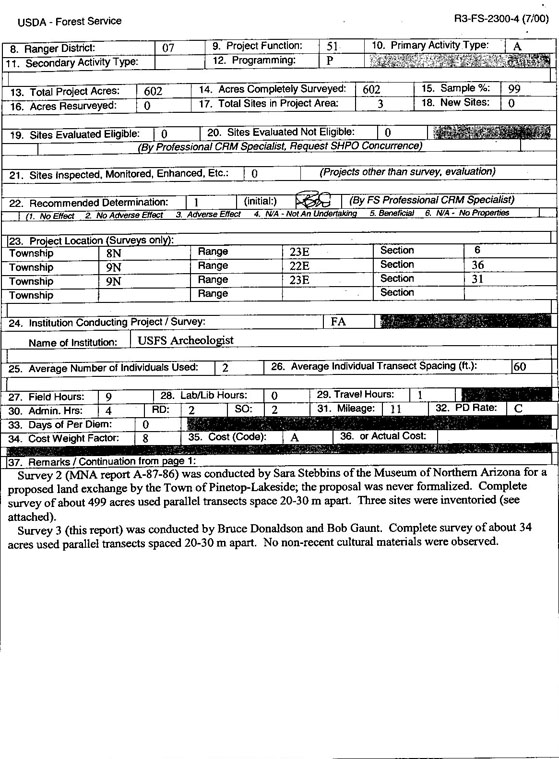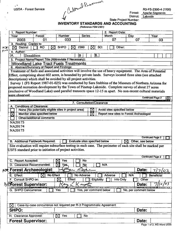US FOREST SERVICE, ARCHAEOLOGIST REPORT