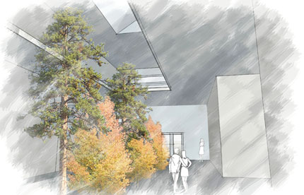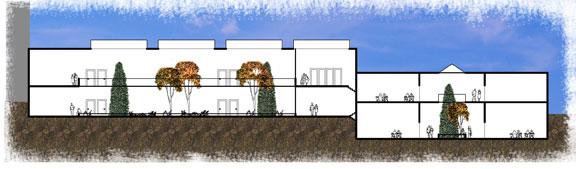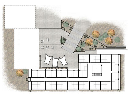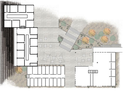 The north building also seeks to work with the site’s unique topography. Both the main building and the expansion flow down the existing slopes. In key areas, the buildings cuts into the hillside, creating the major advantage of saving space above ground, which better matches the low profile character of the surrounding neighborhoods. | |
