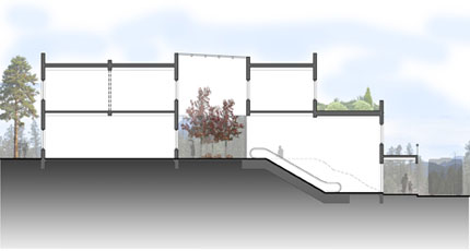 The site’s northeast building shall house the campus administrative functions. Located adjacent to the campus’ main entrance, this building serves as the campus’ main “interior” entrance. Overlooking, Huning St., this building projects a suitable outward face as well. The green roof above the main entrance is a very visible indicator of the Show Low campus’s commitment to sustainability and the environment. The most important feature in this building is its escalator. To reach 8th St. from Huning St., pedestrians have already ascended more than twelve feet. Walking westward, pedestrians would need to ascend another ten feet to reach the campus’ main ground level. The escalator is an urban gift to the public that also invites more pedestrian traffic onto campus. The administration building’s main lobby is a well-lit, double-height space that seeks to create a positive first impression among visitors. A visitor arrives at the top of the escalator into a second atrium containing a skylight and an interior forest. Along with housing financing and general staff, this building will house personnel responsible for the college’s recruiting. Having this building as a public showcase building allows the rest of campus to be somewhat more utilitarian as budget restraints require. |