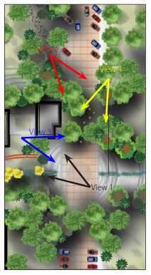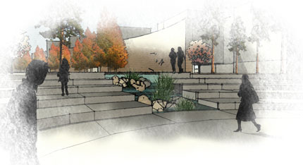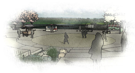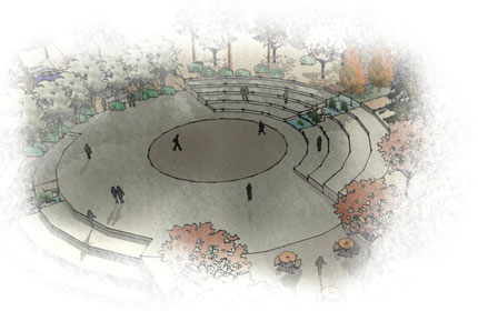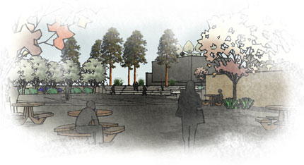 The main entrance plaza is located at the east end of the campus site, where 8th Street and Huning meet. The circular plaza serves as the welcoming hub for the campus and provides a link between the Huning pedestrian mall and the campus. Users will be coming to the campus by vehicle, bicycle, or foot, many using the direct 8th Street route off of the Deuce of Clubs. This street is configured to include a sidewalk, diagonal parking, and a bicycle boulevard. Since it is not desirable to include on-site parking, this street parking will be available for students, faculty, and visitors. The small parking lot to the south of the plaza can be used for disabled and visitor parking, to allow ease and convenience for those visiting the campus. A shaded area with tables used for studying, eating, and relaxing is placed at the north end of the plaza, creating a pleasant first impression to those entering the campus through this space. The plaza is designed to allow for ample flexibility for events and to leave enough flux space for users entering and exiting the site. The central area of the plaza is kept open in order to enhance connectivity with the rest of the community and to preserve views of the meadow, bluffs, and mountains. |