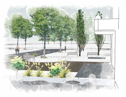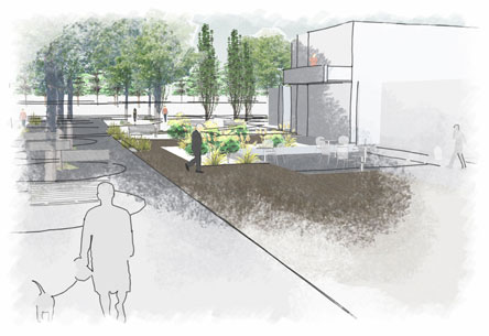 A native plant palette and centralized planting plan create a linear connection from campus to the meadow. Stormwater is collected from hardscape elements and filtered through a centralized swale. Outdoor cafes further reinforce these exterior living spaces.