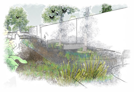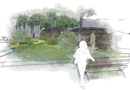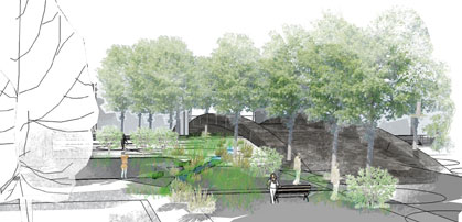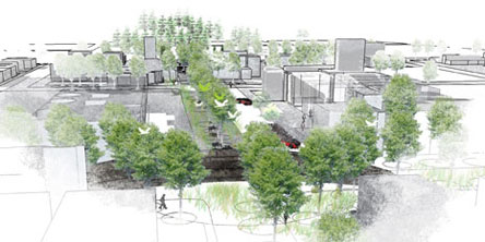 The central swale that leads from campus down Huning feeds into Whipple Wash at the corner of Huning and 10th street. Here a performance or gathering space is initiated at this confluence of urban and natural systems. |