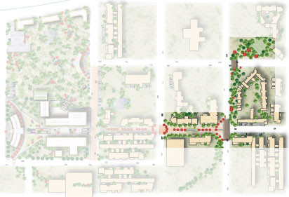 Among the proposals is a pocket park at the intersection of Whipple Wash and Huning as well as a strong central gathering node at the Huning and Campus connection. |