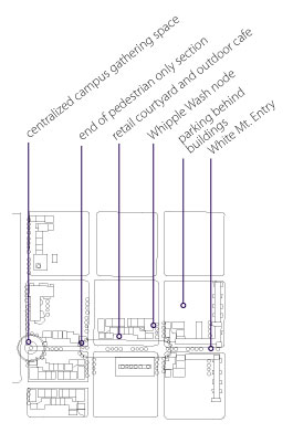 Another component of the proposed off- campus modules and phasing is the integration and revitalization of Show Low Main Street using Huning and 8th street connections. These masterplans propose that over the next several decades, Huning Street develops into a pedestrian-friendly connection for students and faculty, linking campus with commercial, retail, and government offices. This street will not only be a means for connections but will become a destination in and of itself through the integration of focus areas and connection hubs. |