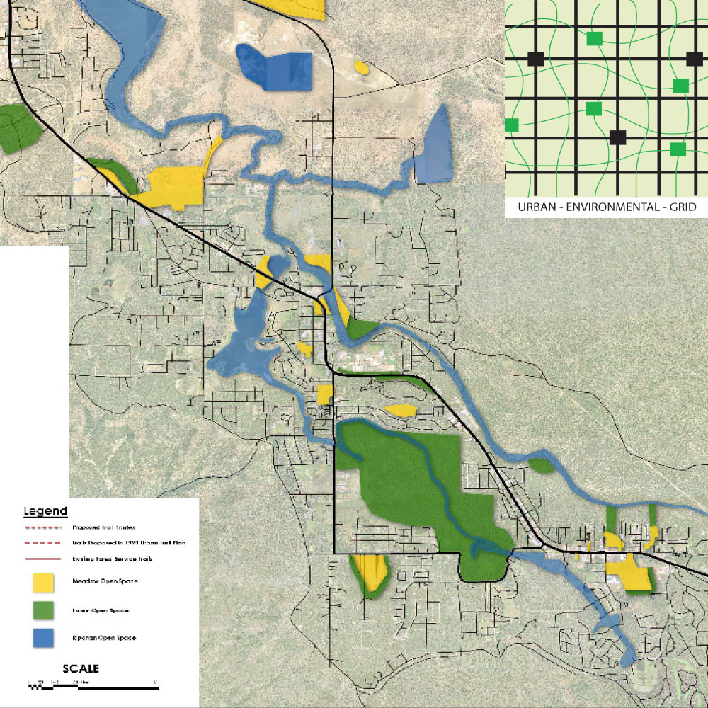 Maintaining open space within a community, whether it is for recreational use or simply as a natural buffer, creates a very welcoming and environmentally aware atmosphere. This is important to Pinetop-Lakeside due to the popularity of outdoor activities in the area. People come to the area to enjoy the forests, lakes, creeks and meadows. It is to the town's advantage to be proactive in preservation and maintenance of open space throughout the town. Then, through the development of a green way and trail system, connections can be make between these wonderful features, creating safe and beautiful routes throughout the entire community. The Urban-Environmental-Grid graphically illustrates how a community can be woven together in a mix of open space, greenways, roads, and structures. It may be unrealistic to maintain all of these open spaces. However, it is important to consider the best use for these spaces while the town still has an option to preserve the natural ecology. |