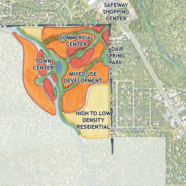 This concept is oriented more towards residents of Pinetop-Lakeside and less toward visitors to the area in that it creates a town center off of 260 and does not include any resort facilities. The town center, located on Walnut Creek, is a high density mixed-use development. The density is highest immediately around the town center, and diminishes as you move outward toward the edges of the development. An enhanced greenway along Walnut Creek and a primary pedestrian connection between Walnut and Billy Creeks creates a strong pedestrian orientation.