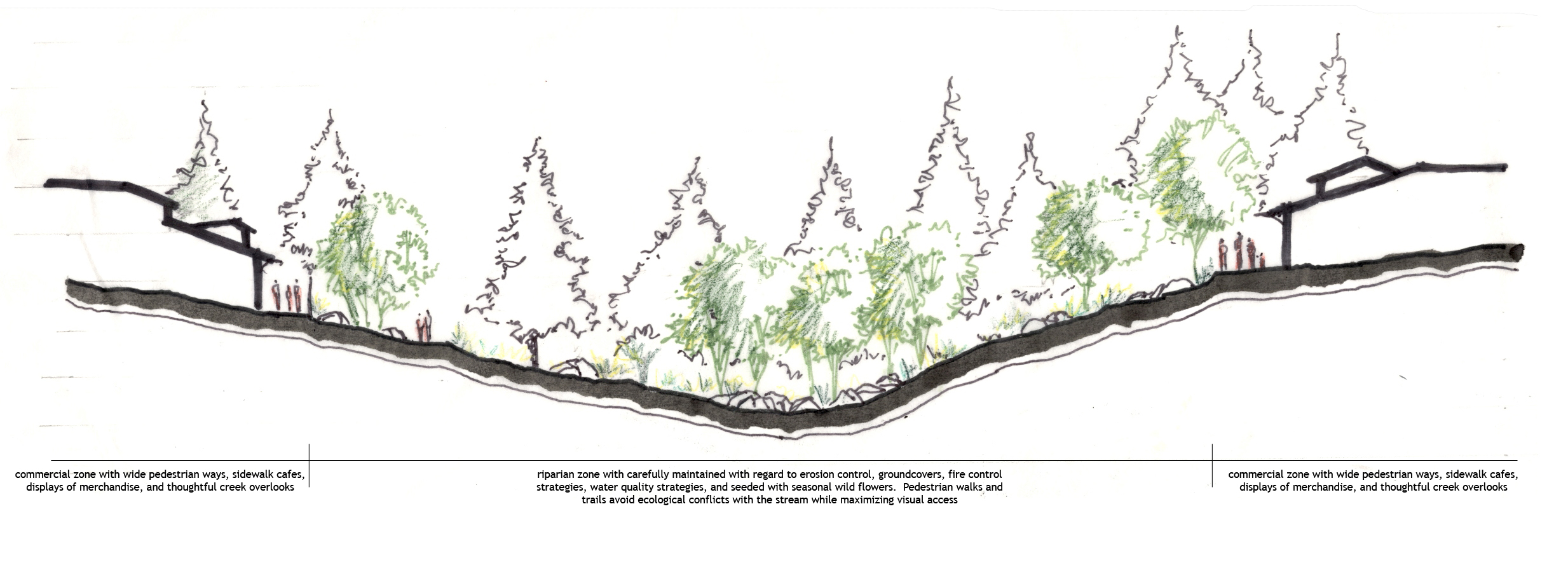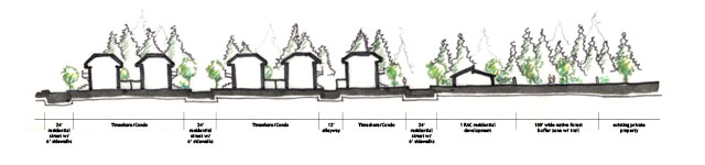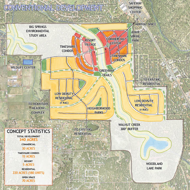 The conventional development is predicated on information the Tejido Group obtained from industry professionals, who indicated that roughly sixty percent of the tract would need to be developed in order to generate the returns that would attract a developer. This option would thus conserve the least amount of open space of the three scenarios. The overall idea behind this concept is a mixed-use kernel that draws on the Walnut Creek node proposed by Tejido during the summer 2006 project. This core area, which lies perpendicular to 260, is embraced by residential development to the south, keeping busier and denser sections away from the lake area. As much as possible, this concept seeks to protect the valuable areas of the lake, Walnut Creek, and Big Springs. The creek has been given a generous buffer of 300 feet on either side. Both recreational areas are allotted a larger amount of space than is currently given with the special use permits. The concept also pushes multi-faceted development rather than a purely residential subdivision. Commercial, mixed-use, and resort areas are included that would provide additional amenities to existing residents of Pinetop-Lakeside.
