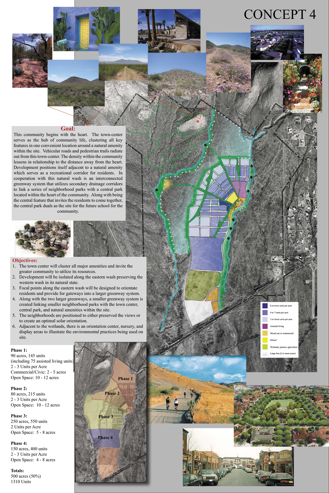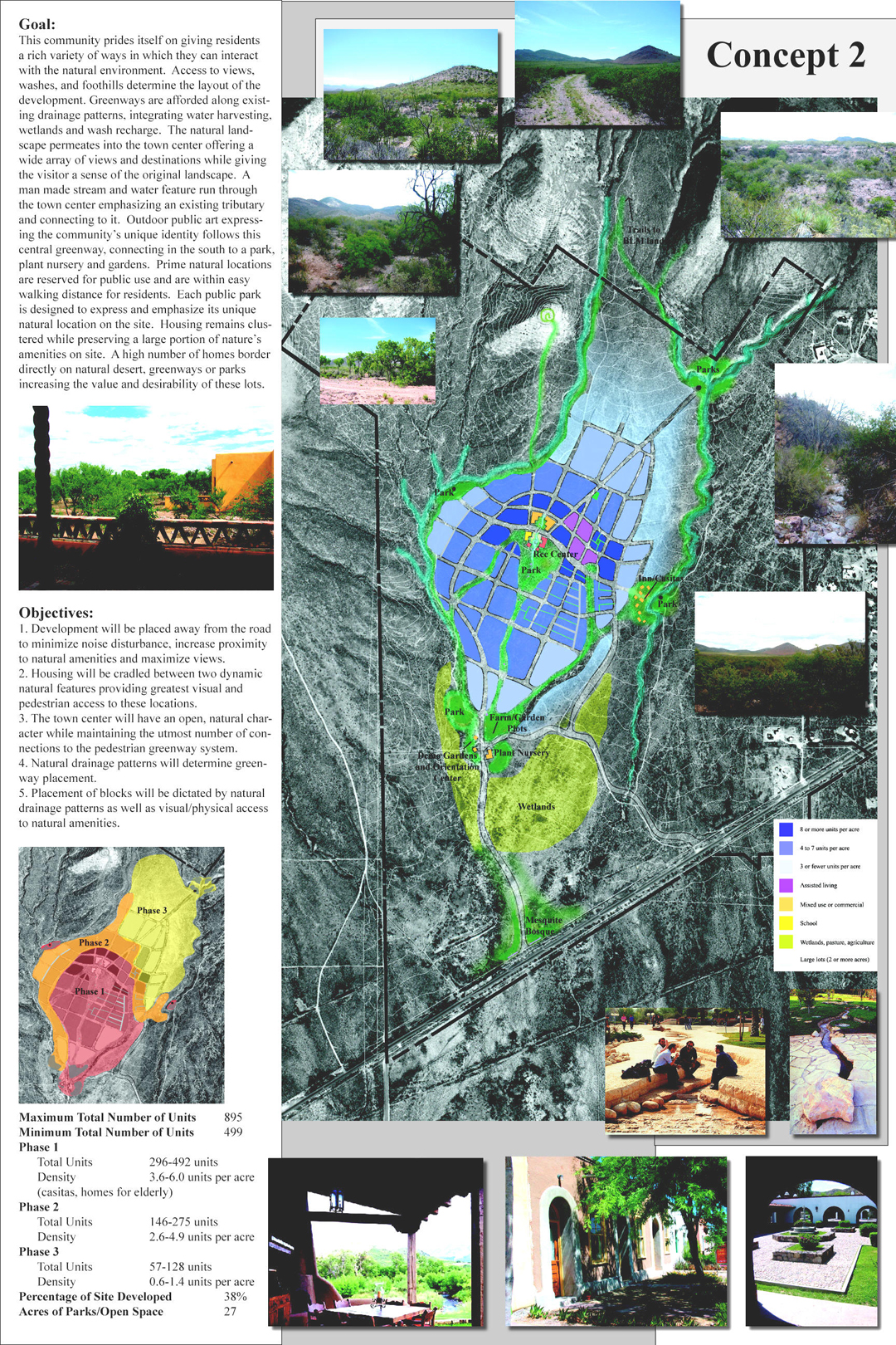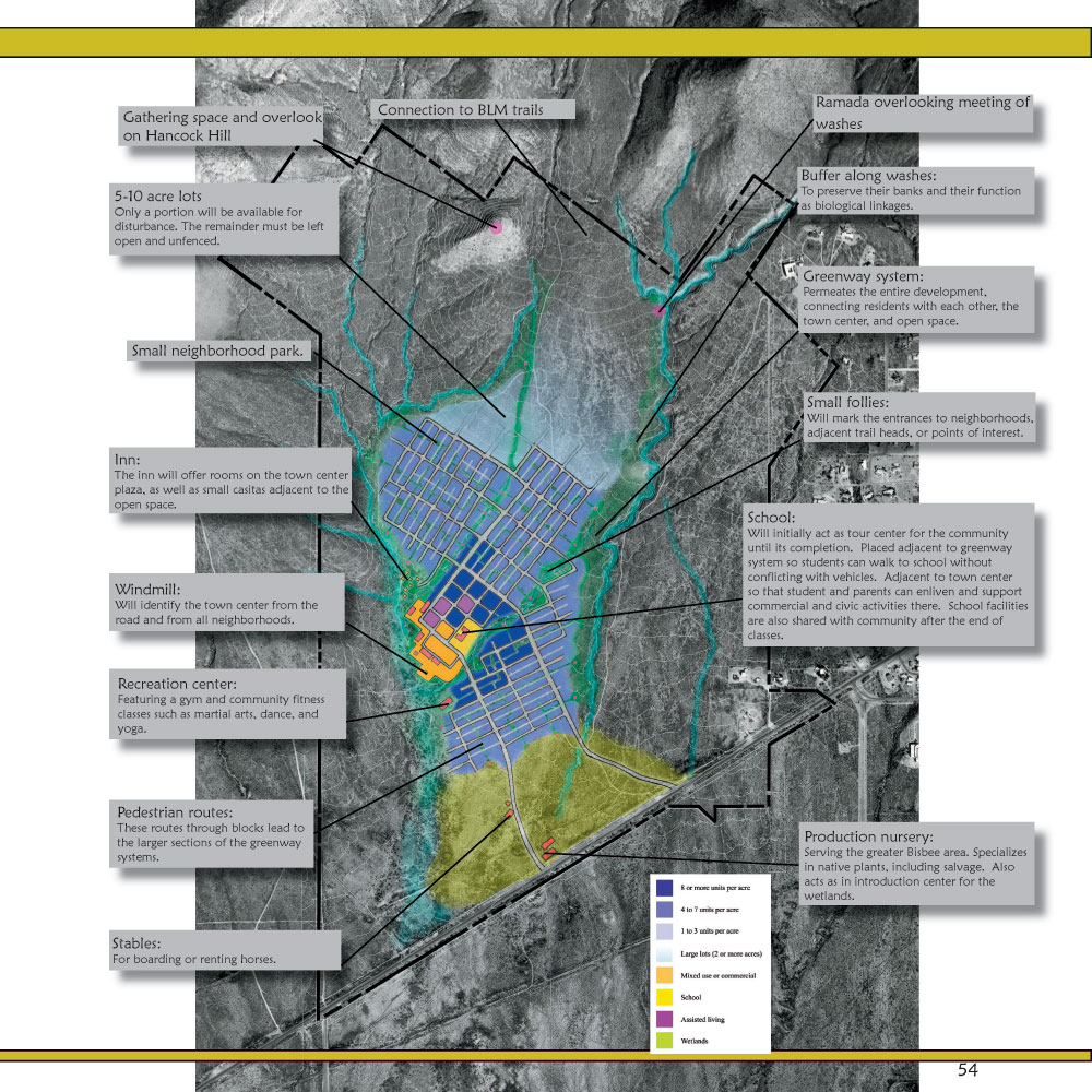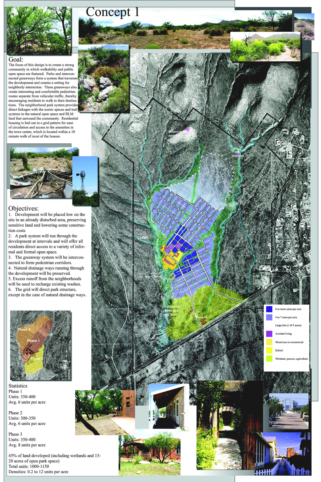 When Dale Turner, a native of Virginia with a degree in forestry, decided to develop 1000 acres of land on the edge of Bisbee, he turned to a professional development firm. His desire was to build a community that would be his legacy to the residents of Arizona, and that would provide direction for the future growth of Bisbee and Cochise County. His wish was for the development to embrace the individualistic charm and character of the site, Bisbee, and other southern Arizona towns, while being unique in its own right, and progressive in its attitudes toward the land and natural resources. Dale was disappointed with the concept he received, which covered the site almost in it’s entirety with a typically sprawling suburban development. After the initial failure, Dale turned to the Tejido Group to create the legacy he had envisioned. The Tejido Group has created the following conceptual master plan for the property, and design and planning guidelines to direct this community’s development, as well as providing guidance for surrounding towns.