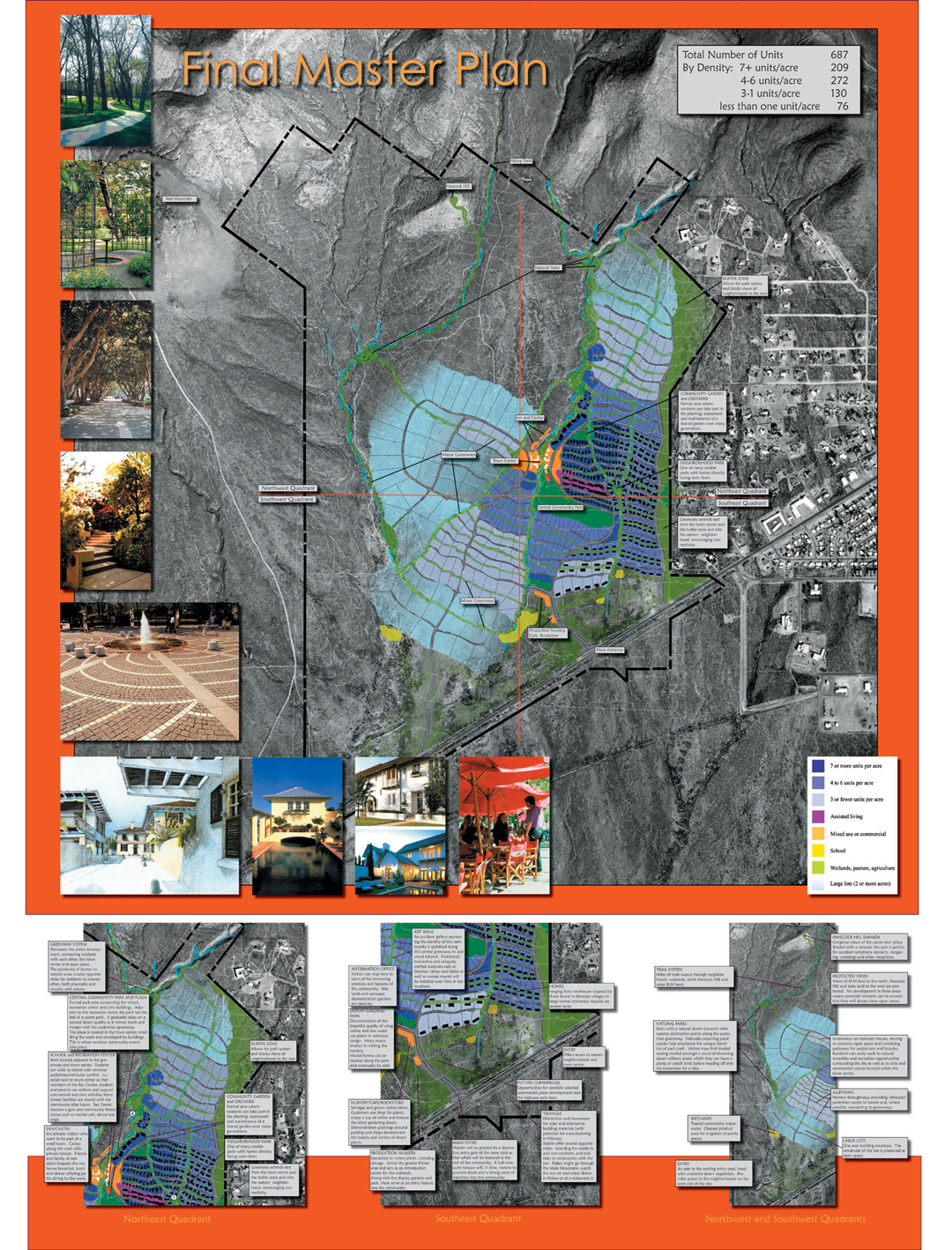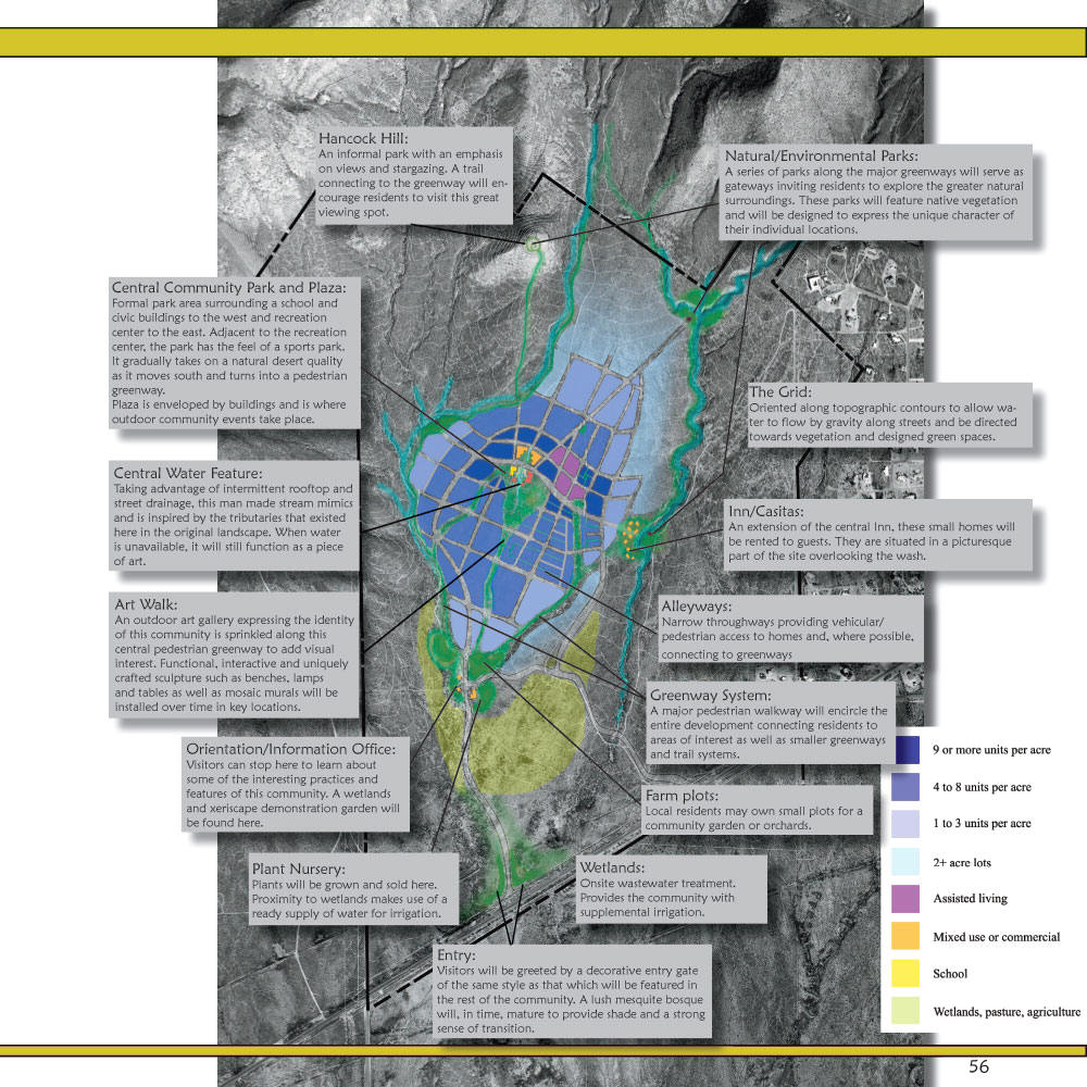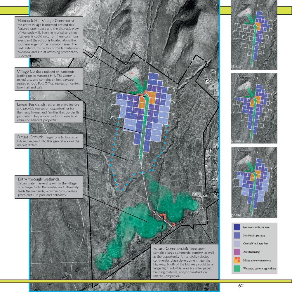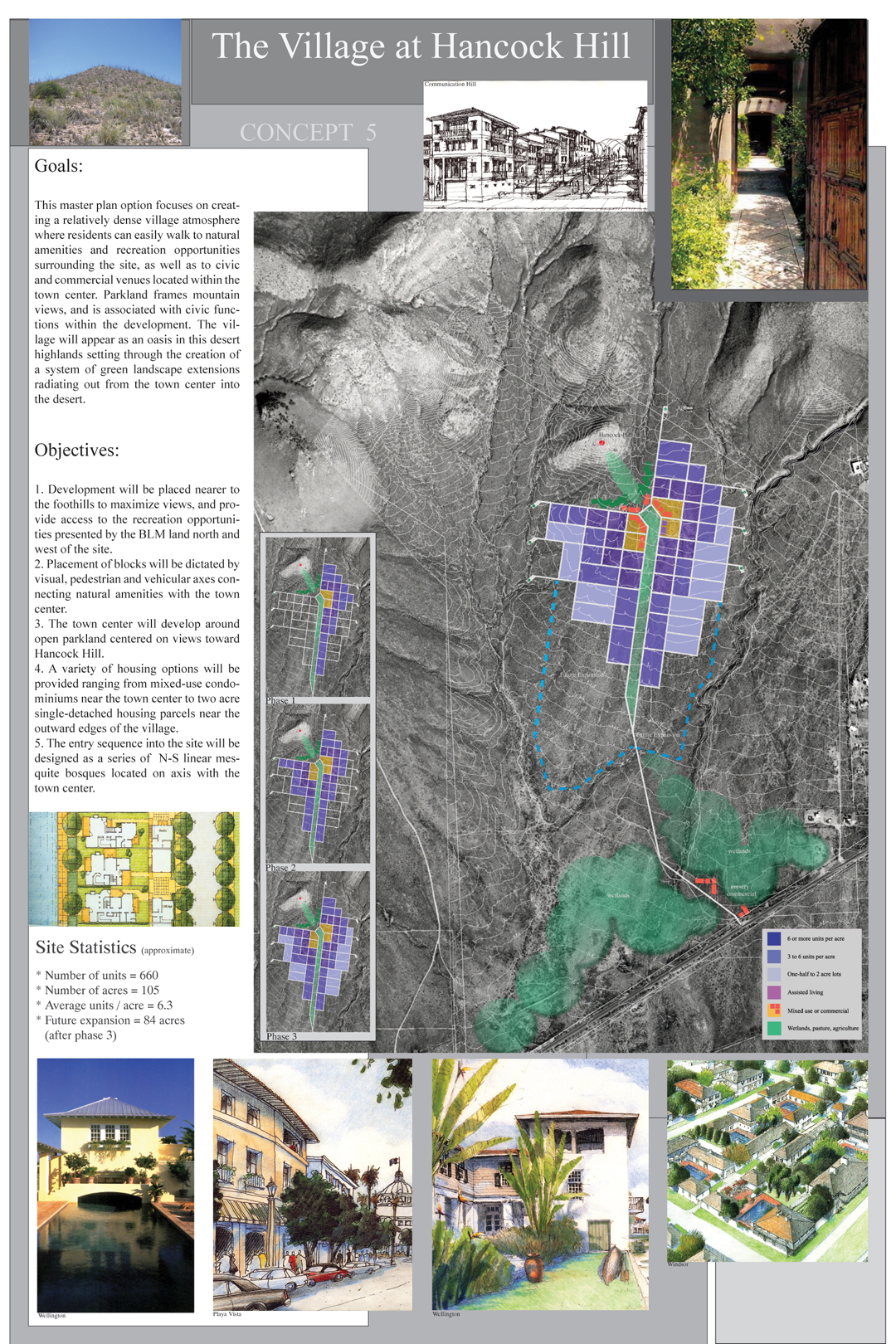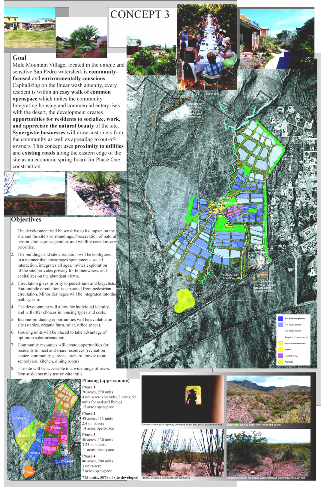 When Dale Turner, a native of Virginia with a degree in forestry, decided to develop 1000 acres of land on the edge of Bisbee, he turned to a professional development firm. His desire was to build a community that would be his legacy to the residents of Arizona, and that would provide direction for the future growth of Bisbee and Cochise County. His wish was for the development to embrace the individualistic charm and character of the site, Bisbee, and other southern Arizona towns, while being unique in its own right, and progressive in its attitudes toward the land and natural resources. Dale was disappointed with the concept he received, which covered the site almost in it’s entirety with a typically sprawling suburban development. After the initial failure, Dale turned to the Tejido Group to create the legacy he had envisioned. The Tejido Group has created the following conceptual master plan for the property, and design and planning guidelines to direct this community’s development, as well as providing guidance for surrounding towns.