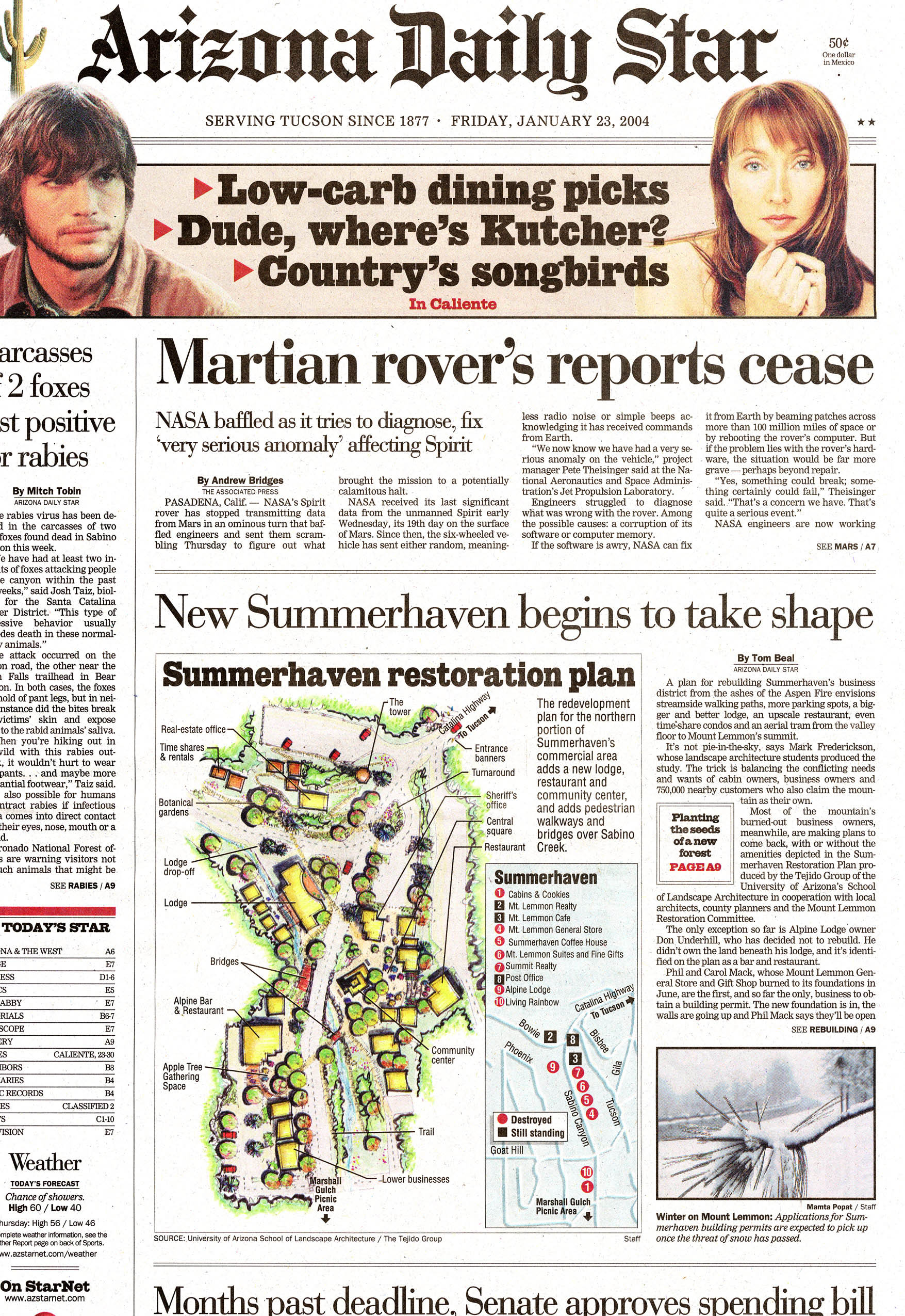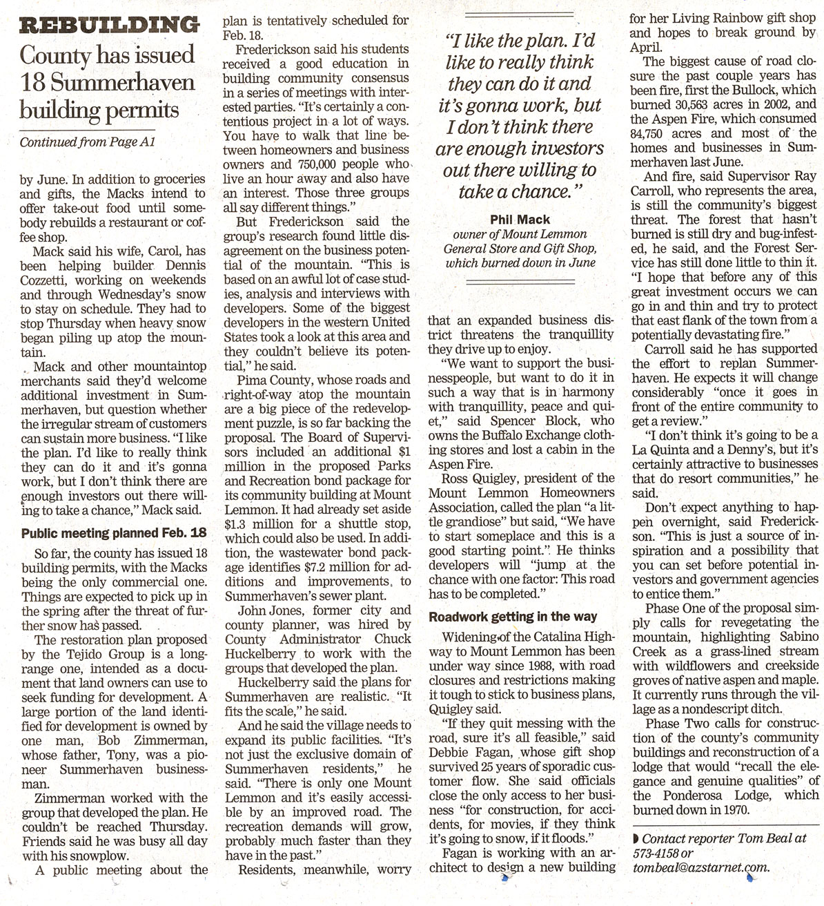 Following the catastrophic fire on Mt. Lemmon, the Governor's office requested that the Tejido Group participate in the reconstruction process. The following redevelopment master plan for the village of Summer Haven on Mt. Lemmon, represents a collaborative design and planning effort among citizens and governmental agencies in Pima County, the American Institute of Architects, the school of Landscape Architecture and the Tejido Group / University of Arizona / This project received a Governor's commendation for community service / 2005.